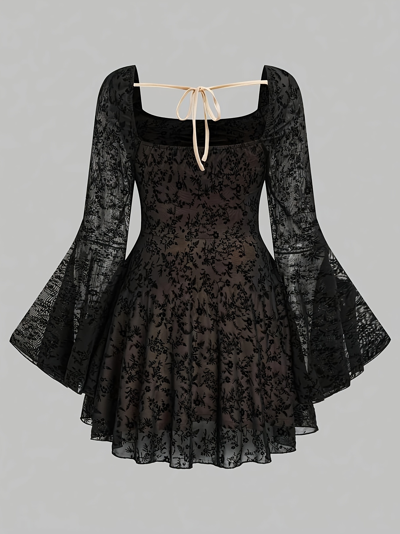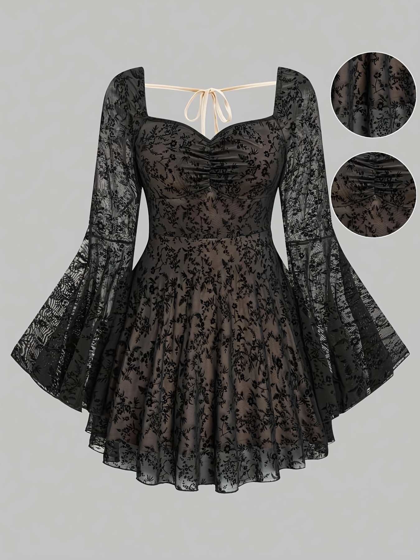 Plus Size - Elegant Plus Size Women'S Faux Fur Mesh Bell Sleeve Dress - Square Neck, Long Sleeve, Black with Golden Accents, All-Season Midi Dress for Formal Occasions, Formal Dresses Elegant, Fitted Silhouette