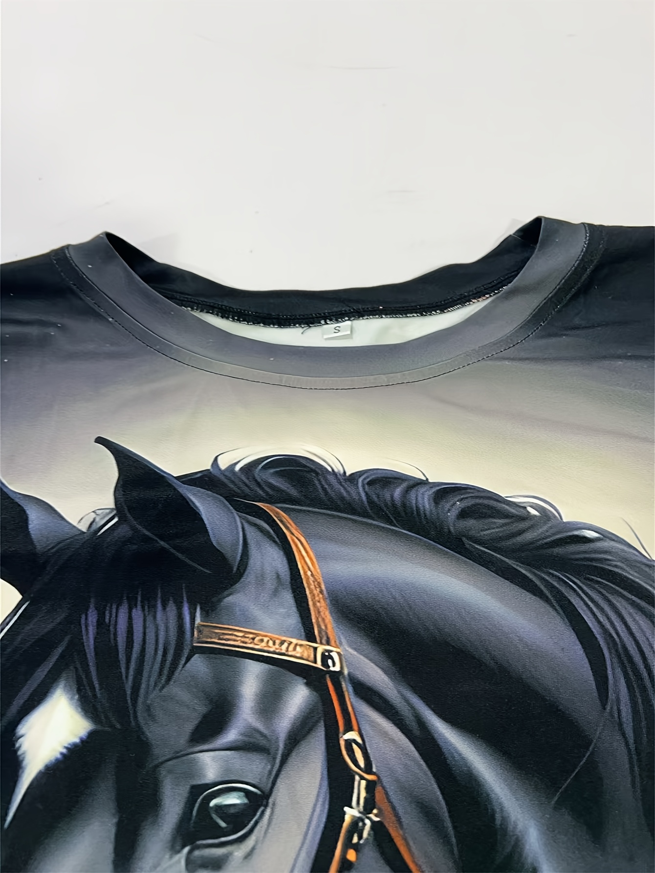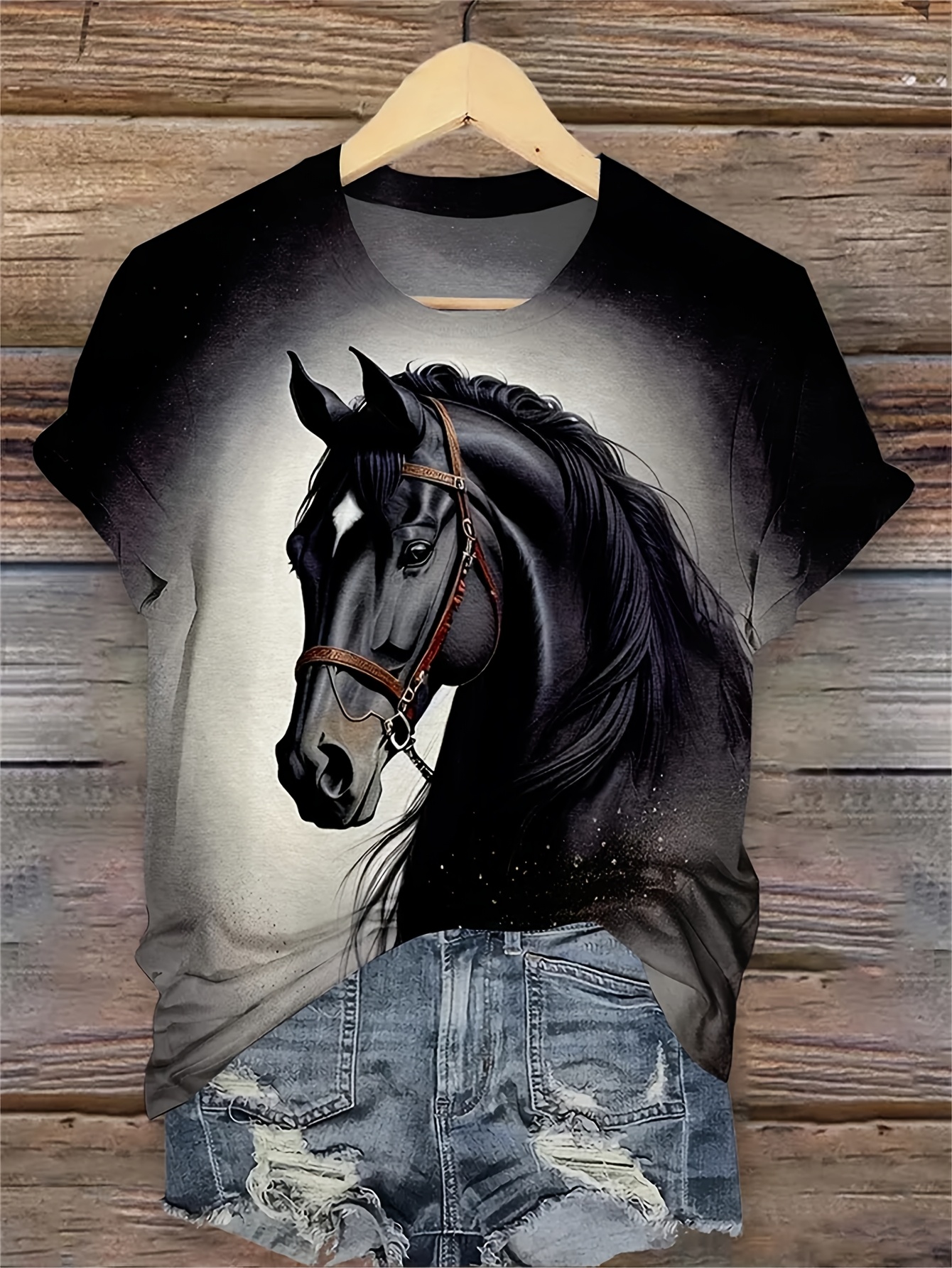 [95% Polyester T-Shirt] Polyester 95% Spandex 5% Women's Summer Casual Crew Neck T-Shirt | Animal Horse Print Short Sleeve Top, All Season Fashion, 175g/m² Lightweight - Perfect Gift for Mom