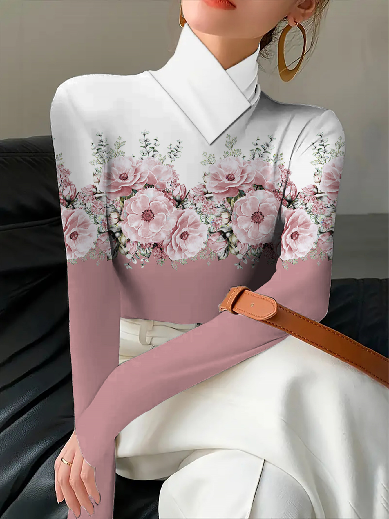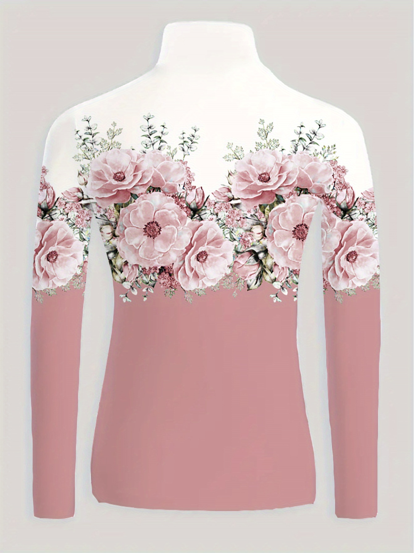 Women's Elegant Slim-Fit Long Sleeve Turtleneck Top with Floral Print - Soft Pink & White H-Line Silhouette Blouse, All-Season Machine Washable Shirt for Casual & Formal Wear