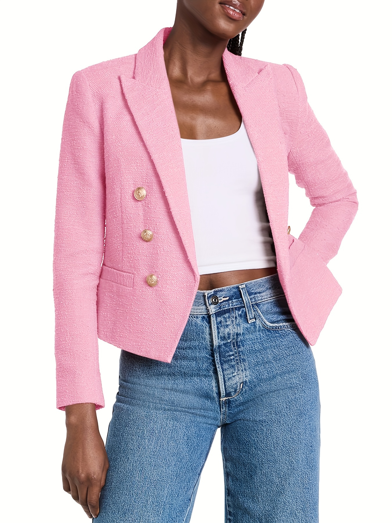 Double Breasted Cropped Blazer, Stylish Lapel Neck Open Front Long Sleeve Business Suit For Spring & Fall, Women's Clothing