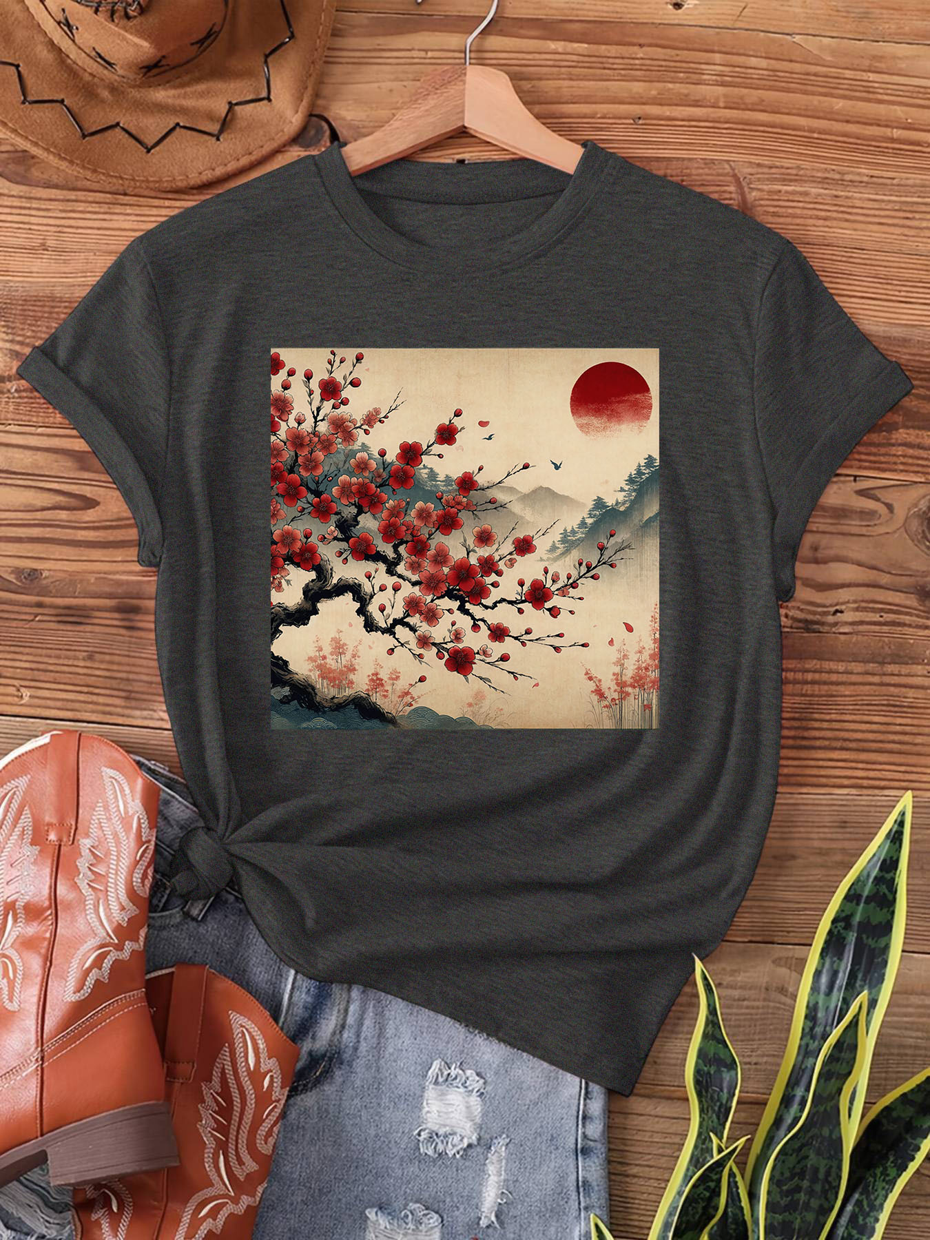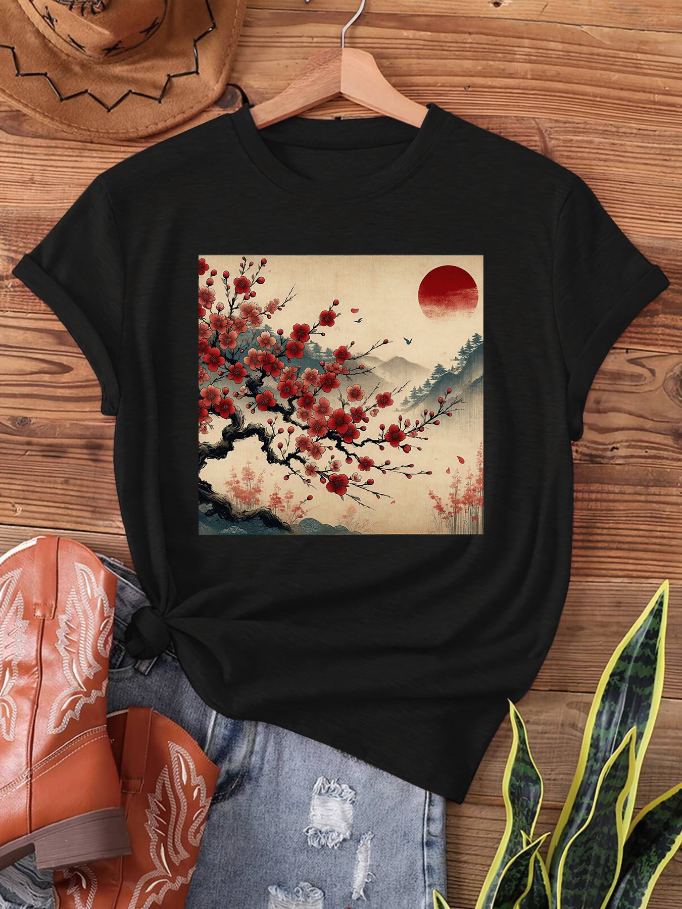 Women's Vintage Japanese Woodblock Print T-Shirt - Cherry Blossom & Red Sun Design, Semi-Sheer Short Sleeve Crew Neck Casual Top, Machine Washable for Spring & Summer, Breathable Fabric