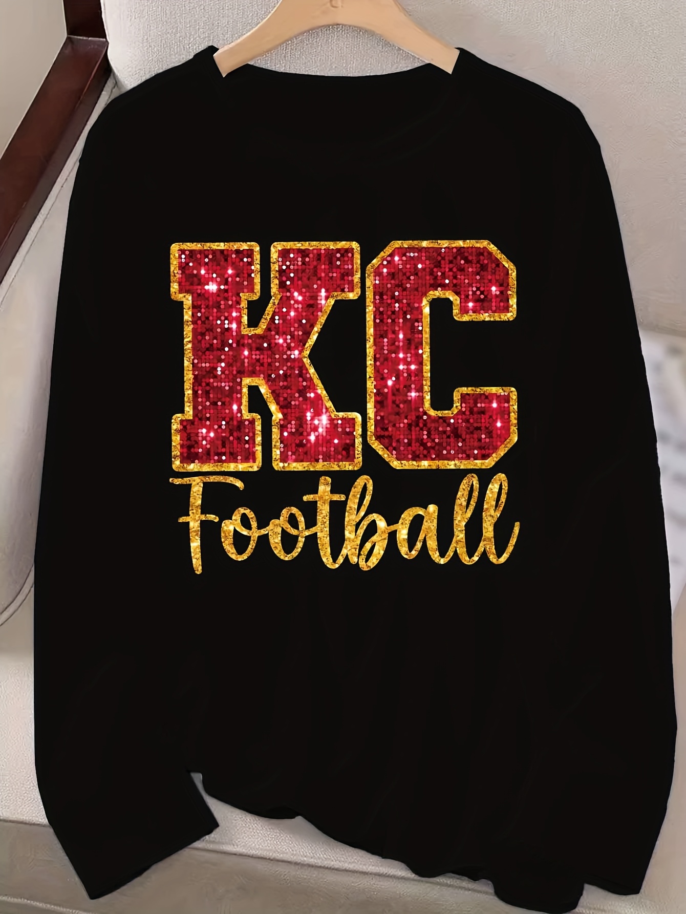KC Football Long Sleeve Crew Neck T-Shirt - Casual, Alphabet Pattern, Regular Fit, Polyester Knit Fabric, All Seasons, No Belt, Long Sleeve, Regular Sleeve, No Chest Pad, Pullovers, Fabric Weight 180 g/m²