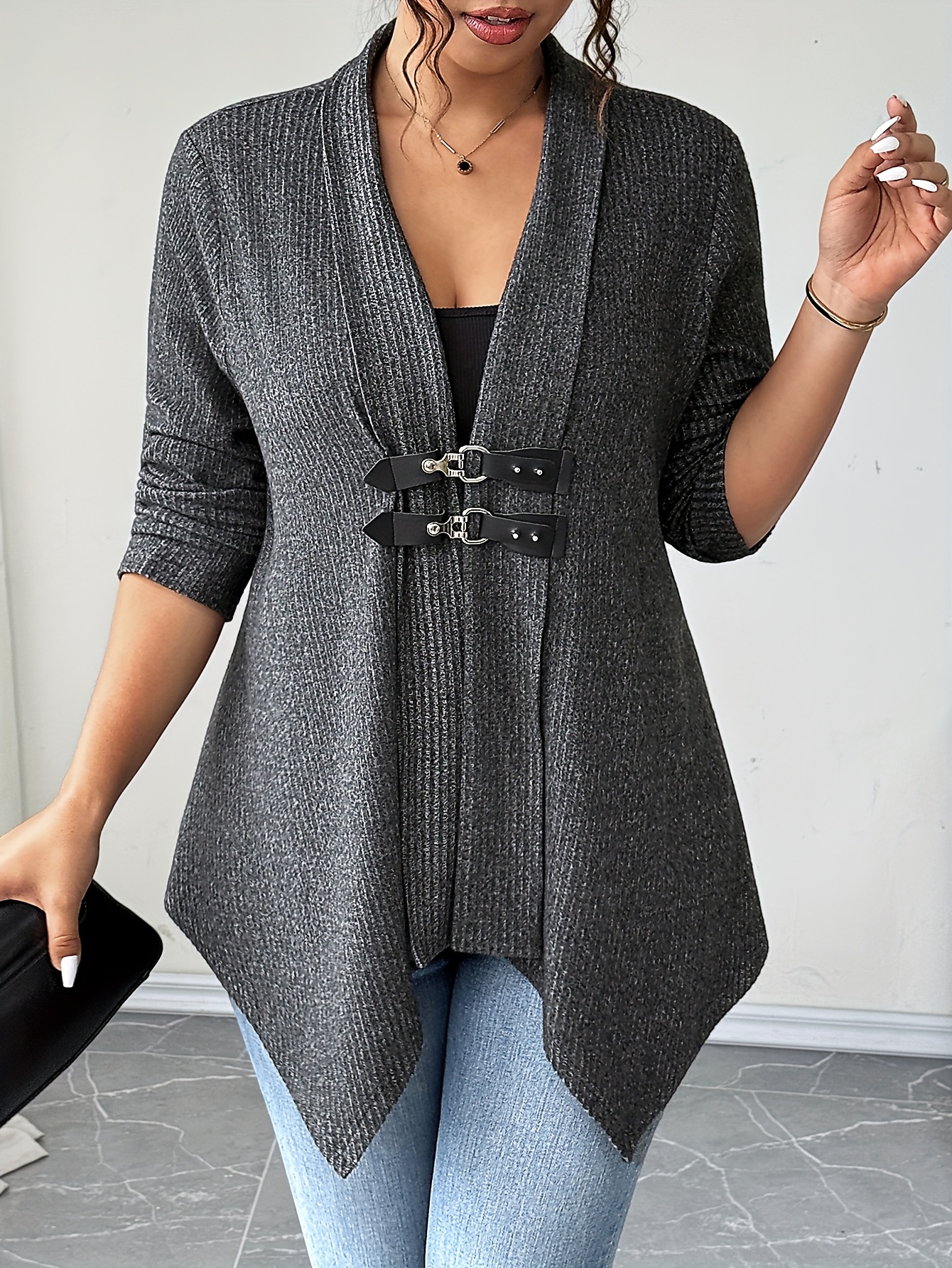 [Plus Size Cardigan] Plus Size - Women's Elegant Casual Cardigan - Long Sleeve, Asymmetrical Hem, Button- Front, Button Closure, Medium Stretch, Solid Color, Perfect for Fall/Winter, Casual Wear Cardigan | Asymmetrical Hemline | Button Closure Coat