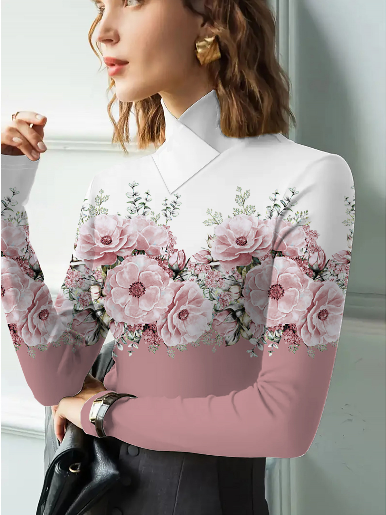 Women's Elegant Slim-Fit Long Sleeve Turtleneck Top with Floral Print - Soft Pink & White H-Line Silhouette Blouse, All-Season Machine Washable Shirt for Casual & Formal Wear